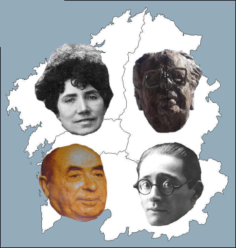 (Por se algún se vos despista, de esquerda a dereita e de arriba a abaixo: Rosalía de Castro, Francisco Fernández del Riego, Valentín Paz-Andrade e Vicente Risco)